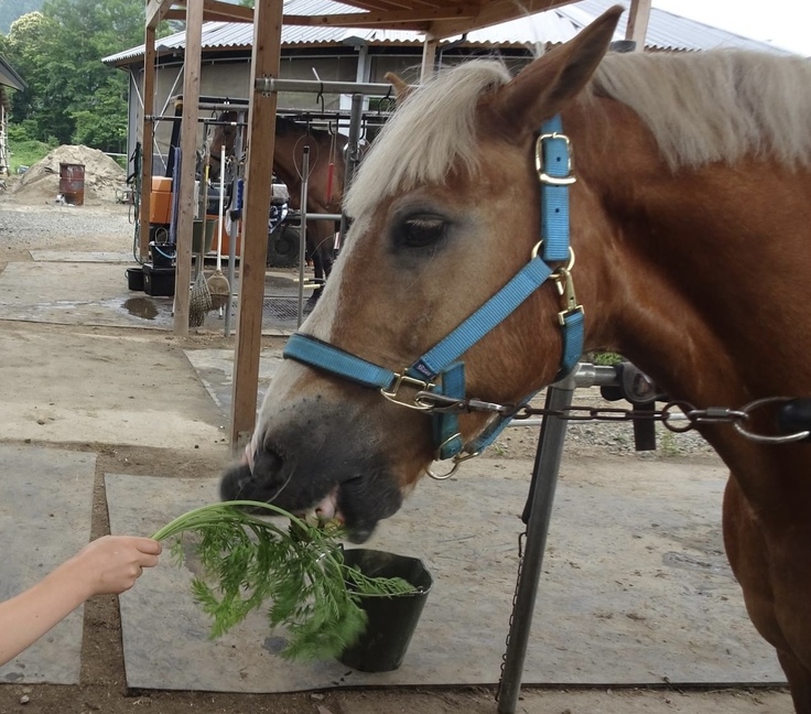 ここ数年前から、乗馬クラブより馬糞(ボロ)をいただいて、元肥として田畑に用いております。そして2年前から「馬が先生、馬場が教室」を理念として活動している馬の学校とのコラボ企画「にんじんを育てて馬にあげよう」を行っております。