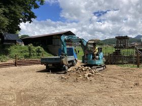 当初は人力で穴を掘って埋める予定でしたが、80cmを掘り下げるのは大変な作業です(後で分かったことですが、跡地には大きな石をはじめ、古民家で用いられていた様々なものが埋められており、とても人の手では掘ることが出来ませんでした)。