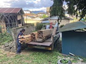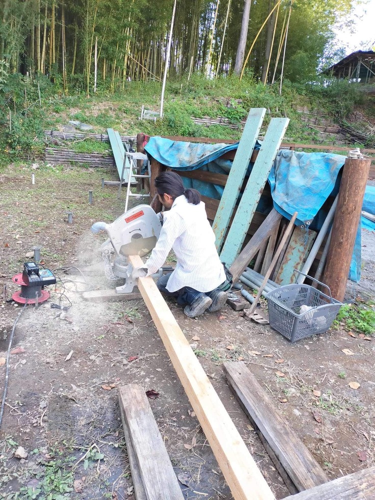 続いては、カラマツ材をカットして単管パイプに設置する工程です。