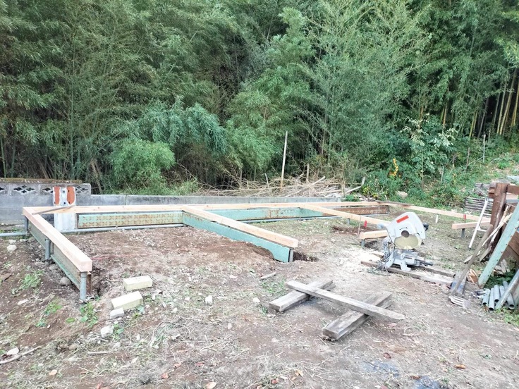 続いては馬小屋内の土が流出しないよう、また雨水がうまく流れるように土留めを設置します。