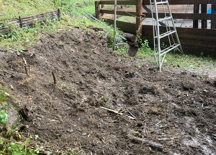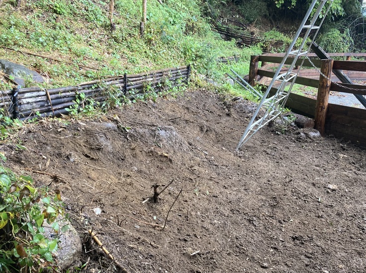 雨水が溜まりがちな西側は、土留めしてある一角を崩してならしながら、窪んでいる箇所に土を盛りました。