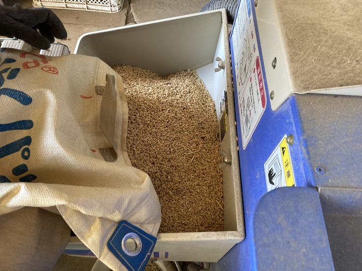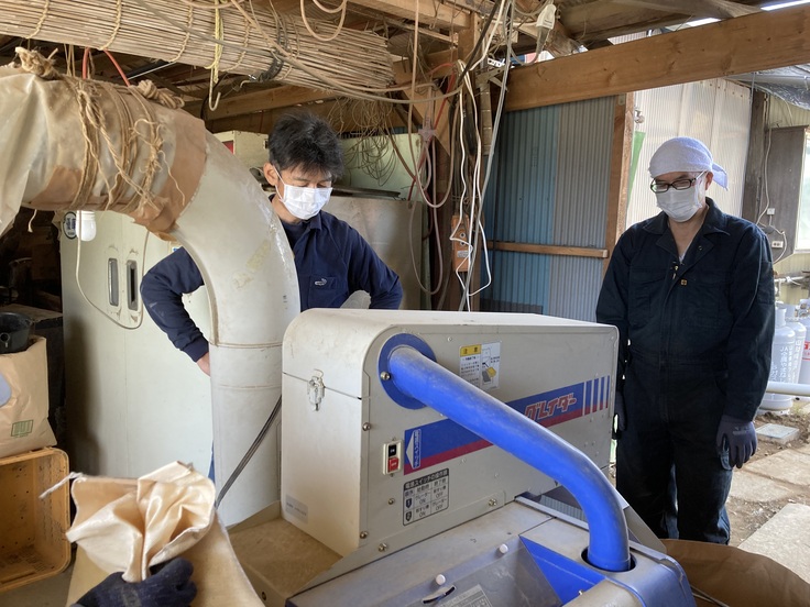 先月稲こき(脱穀)を行い籾付きの状態で保管されていたお米、本日籾摺り作業を行いました。