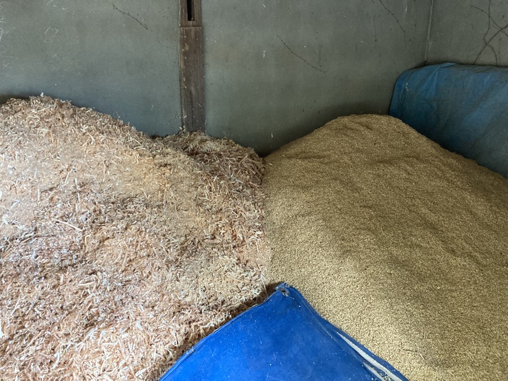 籾殻はおが屑と共に倉庫に保管します。