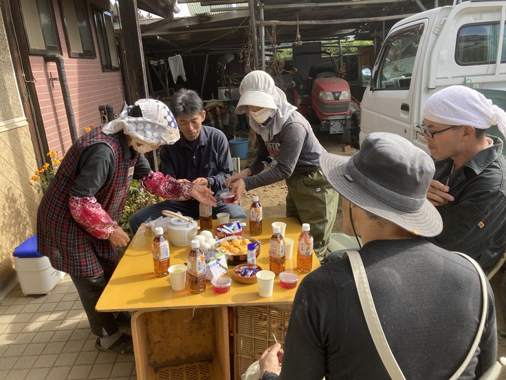 作業の合間にお茶の時間をとり、様々な話題で盛り上がります。