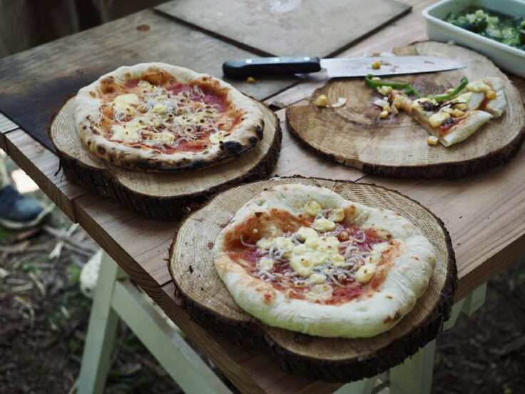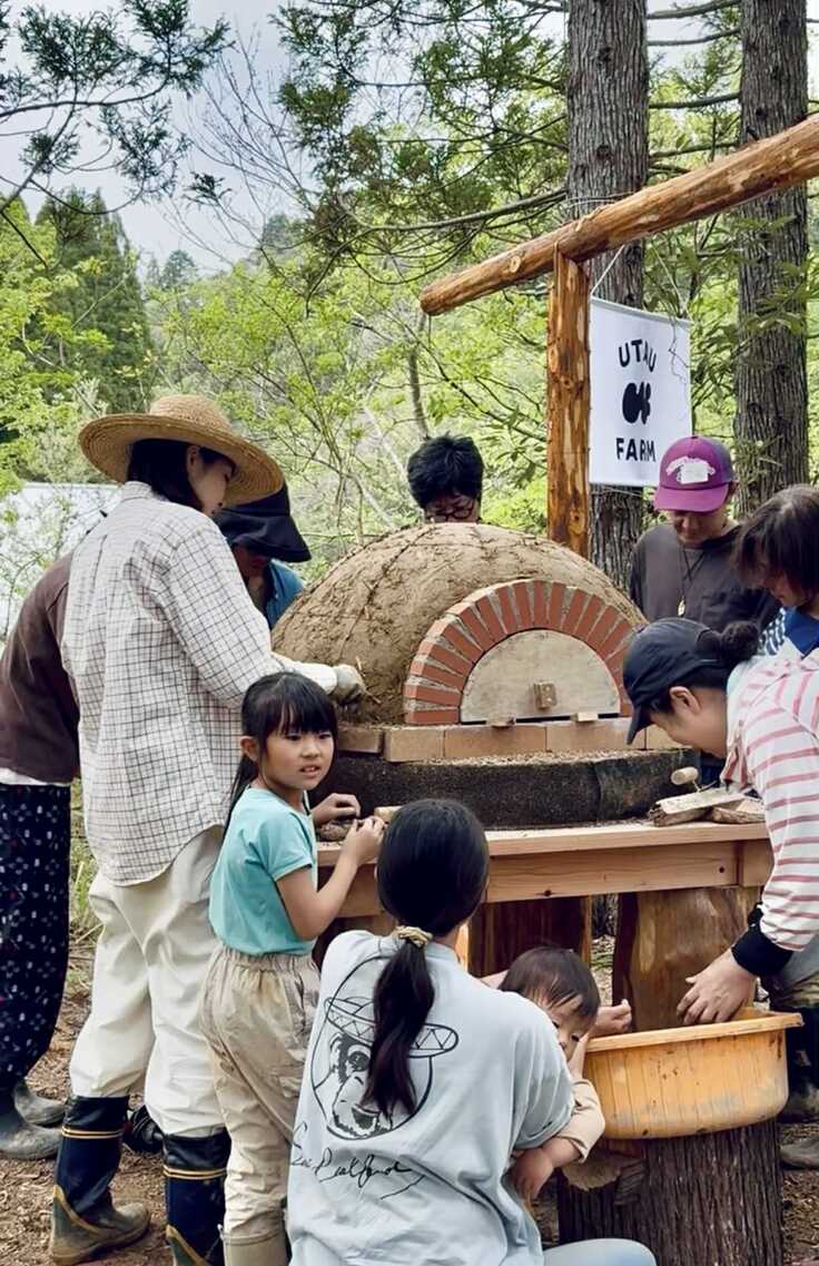 「ピザ窯(アースオーブン)をつくろう」では、延べ4日間+αで牧場の粘土や牛フンを活かしたピザ窯を輪になって作り上げ、完成後にピザパーティでお祝い。