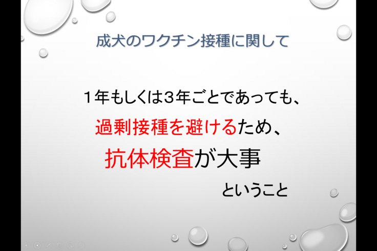 さらに、今年から愛玩動物看護士が国家資格となり、まさにその資格試験のテキストには『3年に1回の混合ワクチン接種』と記されています。今後その知識を持った看護士がスタッフとなった時、『毎年のワクチン接種』をどう説明するのか、獣医師側に問われることになります。そうした現状は、『毎年の混合ワクチン接種証明書の提示』を求めているドッグランや犬と泊まれるホテルなどの施設が規則を一気に変えることにつながると期待しています。付け加えますと、近年では『抗体があるならワクチン接種は必要ない』ということで3年に1回も多いという認識が広まりつつあります。