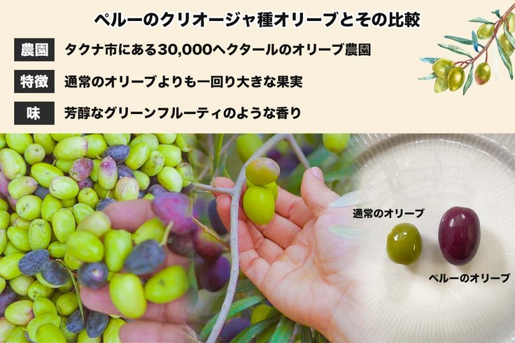 「通常のオリーブよりも一回り大きく、ぷっくりとした果実」、「芳醇なグリーンフルーティの香り」が特徴のクリオージャオリーブはペルーでしか育ちません。