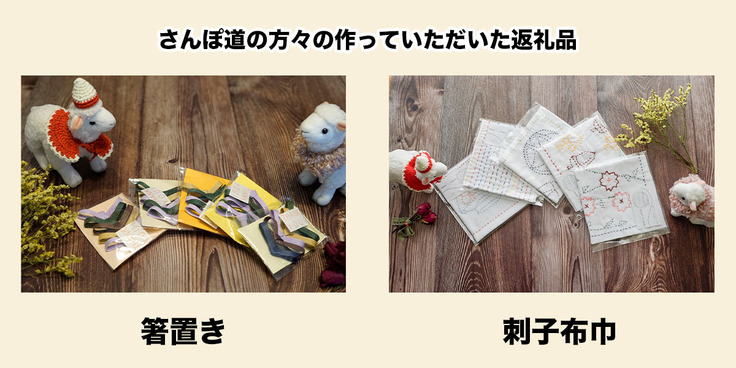 今回のリターンの一部には「さんぽ道」手作りのクラフトテープの箸置きや刺子布巾も入っております。