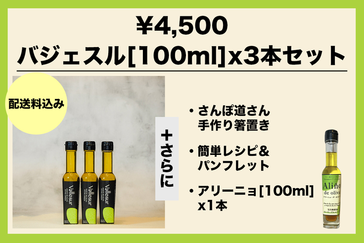 バジェスル100mlボトル x 3本(合計300ml)、アリーニョ 100mlx1本