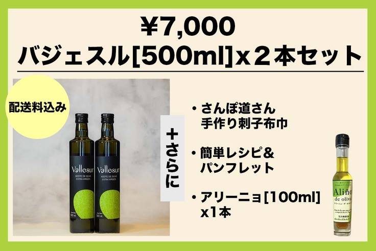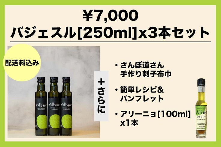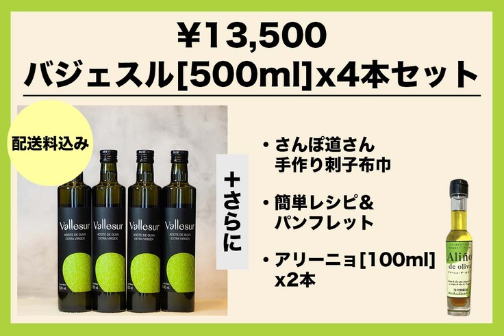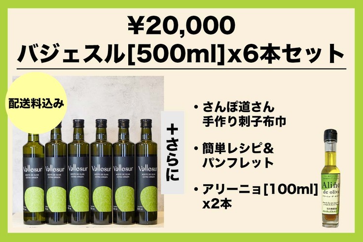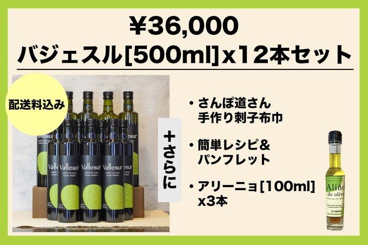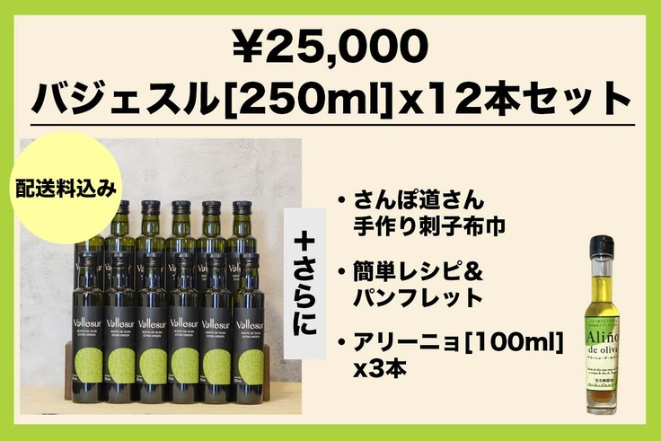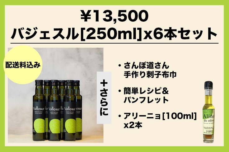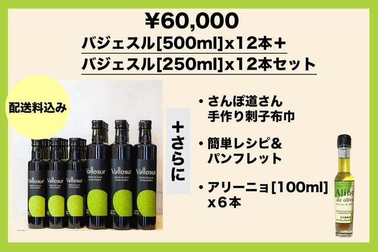 A: バジェスル250mlボトル x 12本 & バジェスル 500ml x 12本(合計9L), アリーニョ100mlx6本 + 手作り刺子布巾, オリーブオイルレシピ