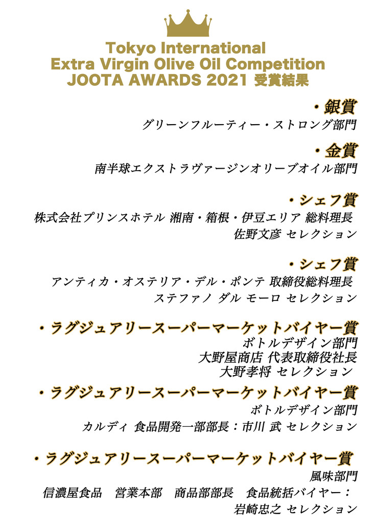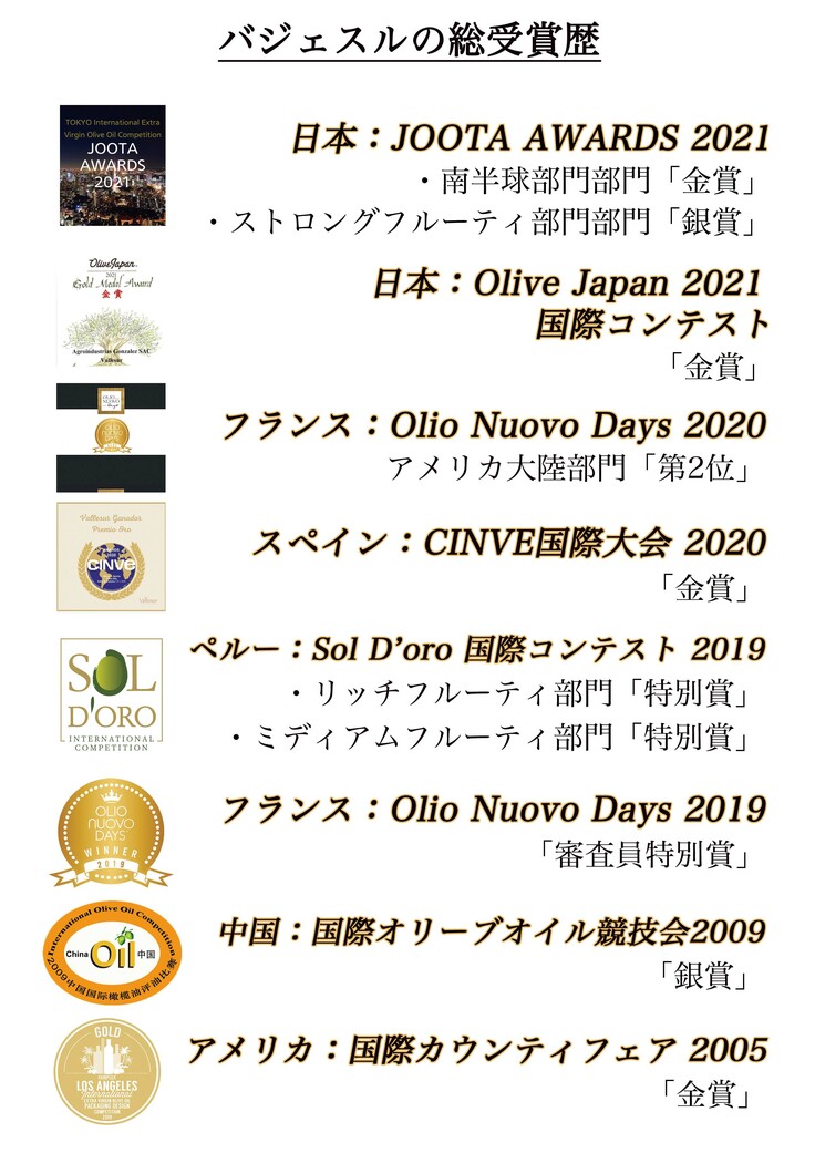バジェスルは今年5月に行われたOlive Japan 国際オリーブオイルコンテストにて金賞を受賞したのに続き、8月の国際オリーブオイルコンテスト【TOKYO 国際EXバージンオリーブオイルコンテスト JOOTA AWARDS 2021】のストロングフルーティ部門で「銀賞」、そして南半球部門で最高位の「金賞」受賞を達成しました。