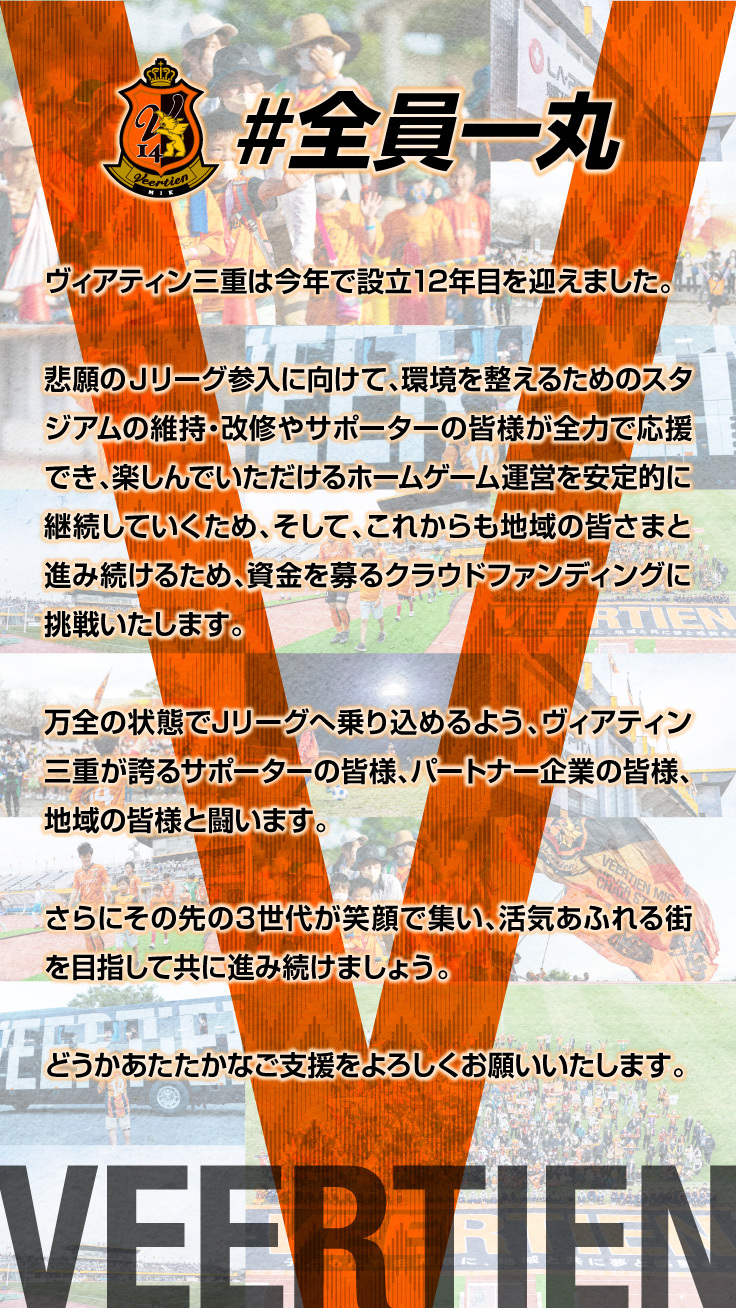 ヴィアティン三重が、Jリーグ昇格に向けたスタジアムの環境整備や、ホームゲームの運営費用として350万円を募ります。目標金額以上を集めることができた際は、これからの将来にかかるメンテナンス費用等に充てさせていただきます。