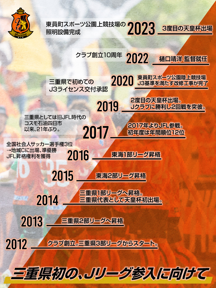 男子サッカーは三重県3部リーグからスタート。毎年昇格を重ね、2017年からはアマチュア最高峰のJFL(日本フットボールリーグ)に参戦をしています。
