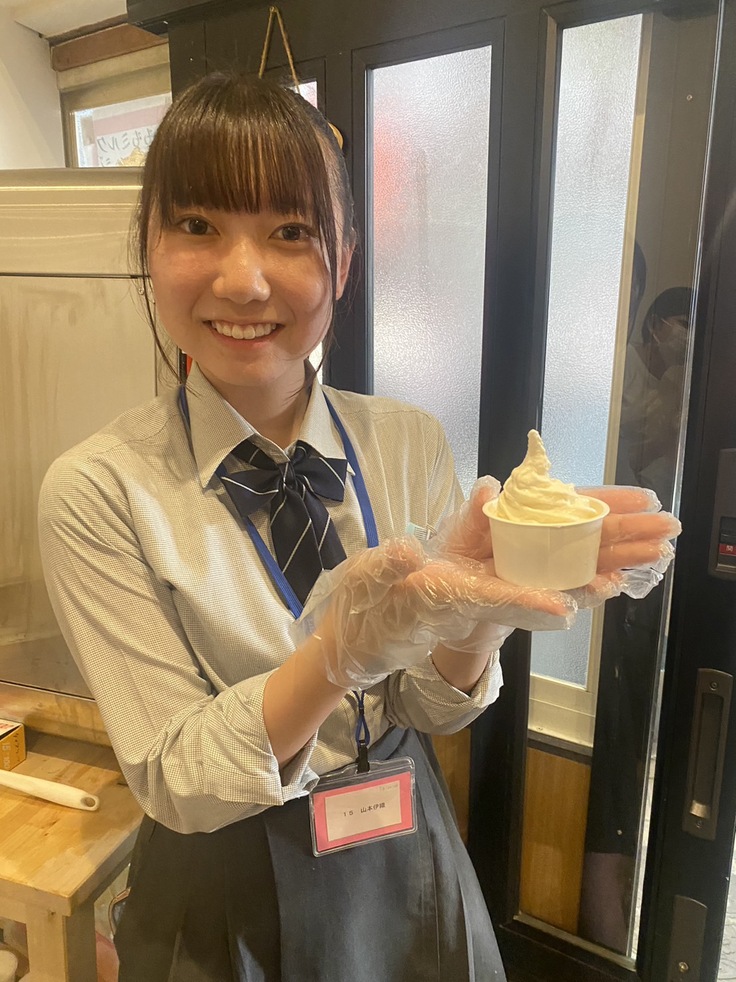 2023年7月、金光学園高校2年生有志3名が「果物ロス」を解決するビジネスアイデア「SDGs白桃ミルクジェラート」を開発しました。8月上旬に行われた「おかやまSDGsフェア」で販売し、用意していた185個完売しました。現在は、ユースセンター内にある「カフェベルデ」で常設販売中。