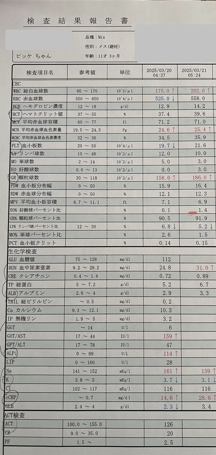 ・今朝の血液検査の結果では、手術の影響で血小板の低下や軽い貧血が見られましたが、いずれも想定の範囲内です。