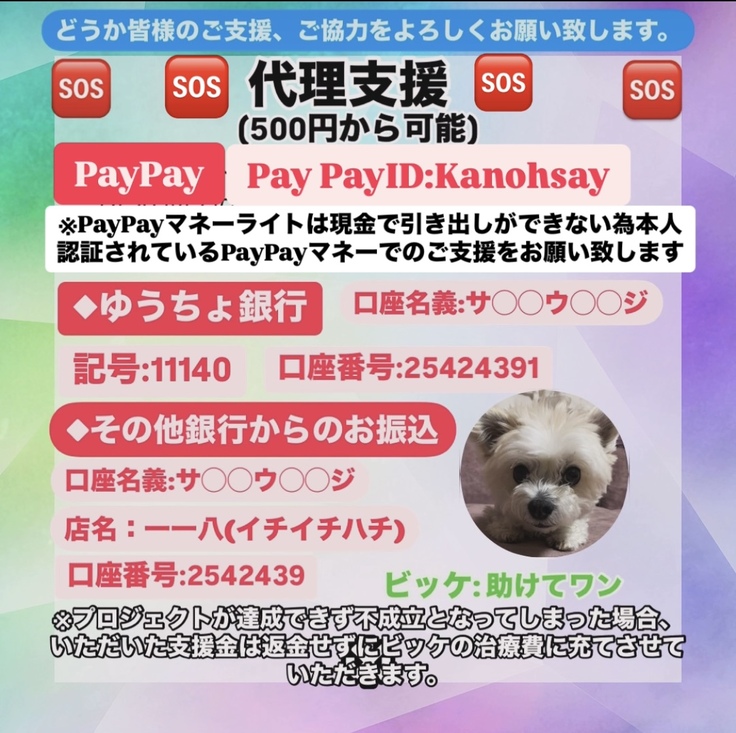 ※プロジェクトが達成出来ず不成立となってしまった場合、いただいたご支援金は返金せずにビッケの治療費に充てさせていただきますのでご理解いただいたうえで、ご支援いただければ幸いです。