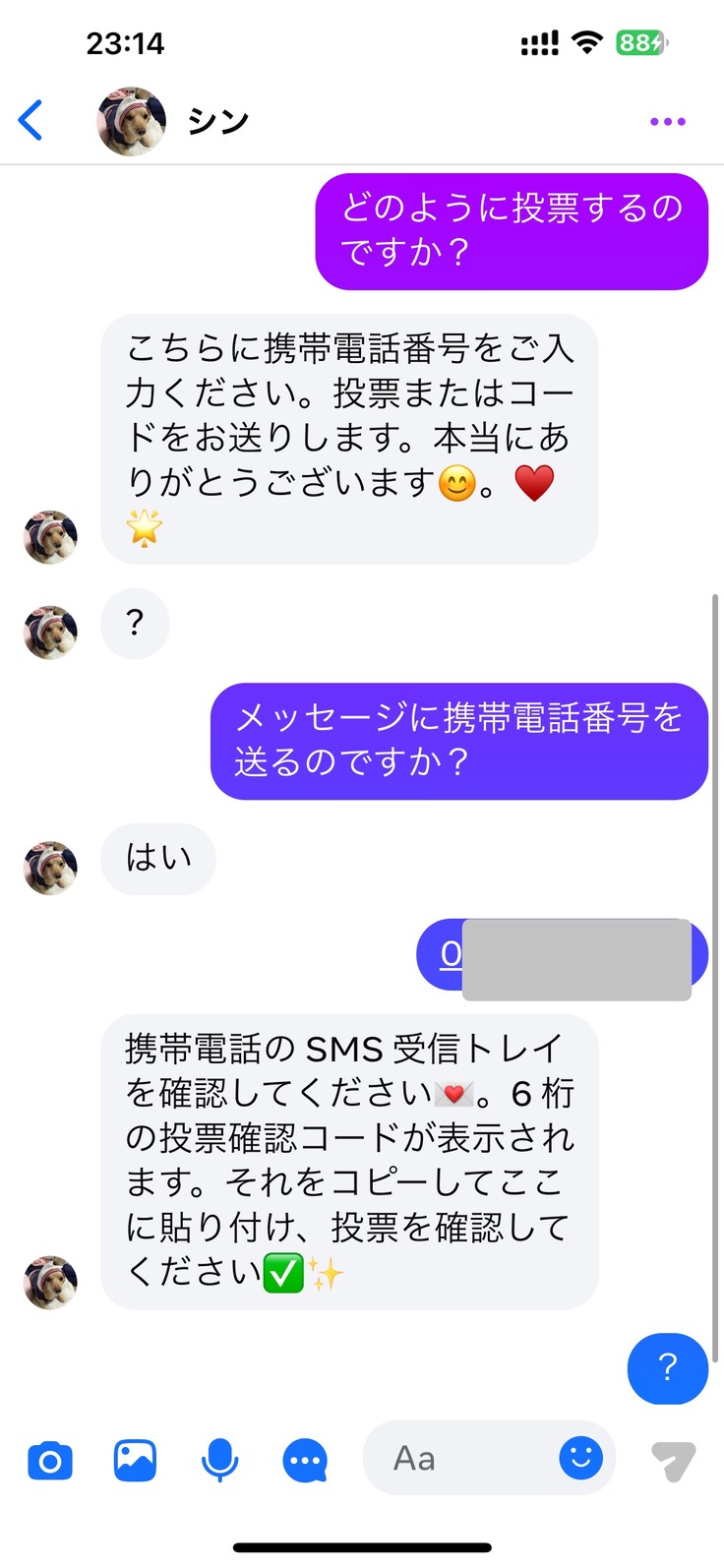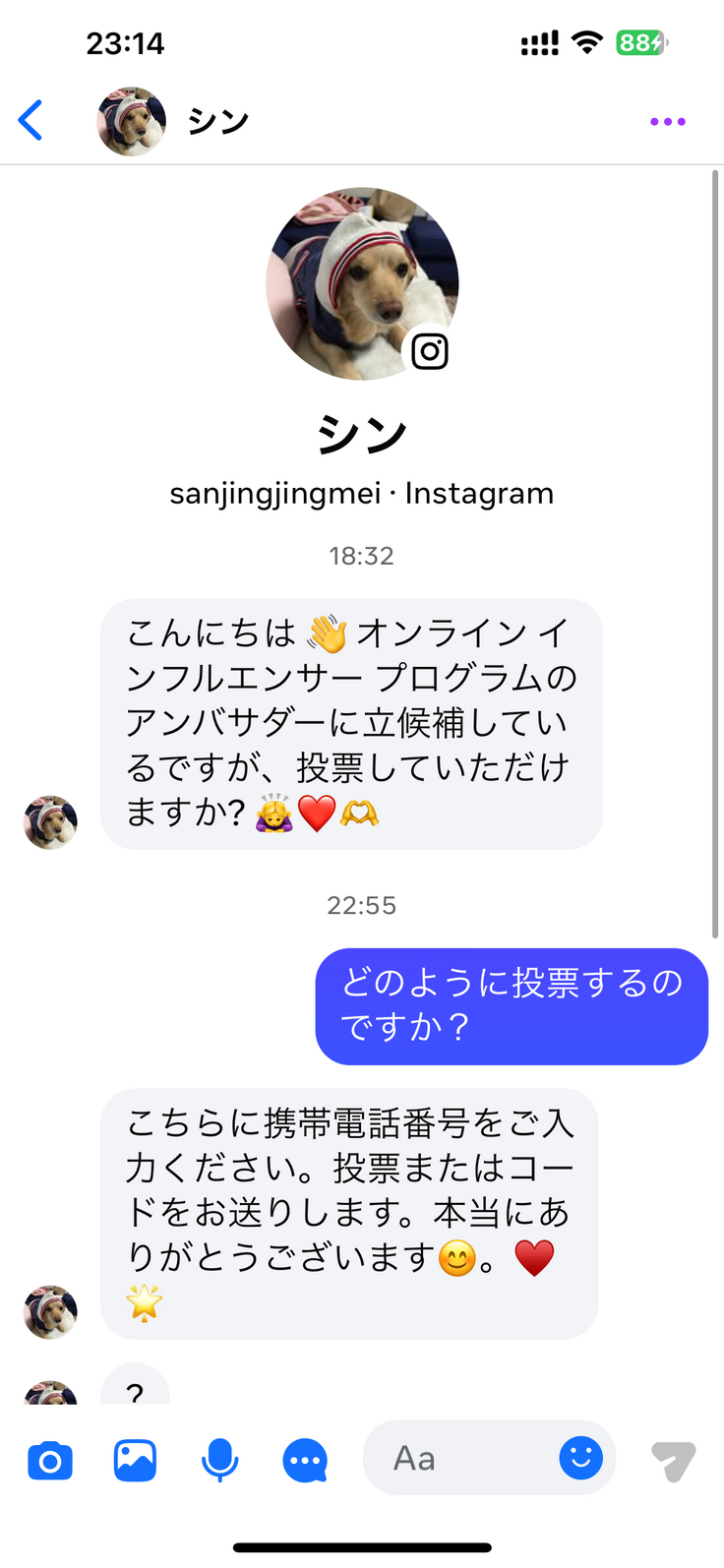 今回の乗っ取りは、下記のようなダイレクトメッセージで「オンラインインフルエンサープログラムのアンバサダーに立候補したので投票してほしい」と依頼され、携帯電話番号やSMSで届いた認証コードを送信するよう求められる手口でした。
