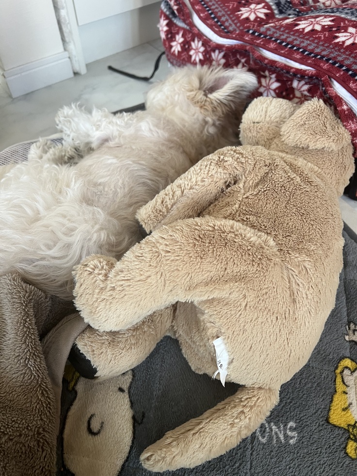 ビッケの退院祝いに買った犬のぬいぐるみさんが乗っ取りにみえてしまいました💦ぬいぐるみさん、ごめんね。