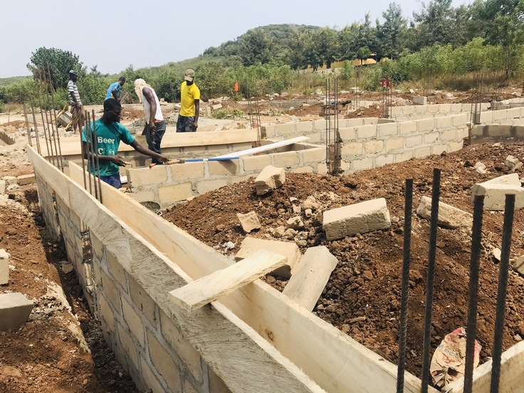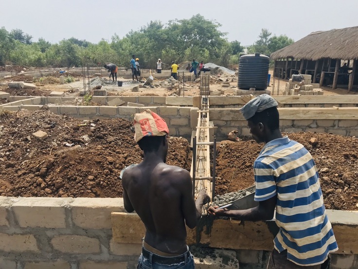 今まで積み上げてきたブロックに板を取り付けて、そこにセメントを流し込んでいく