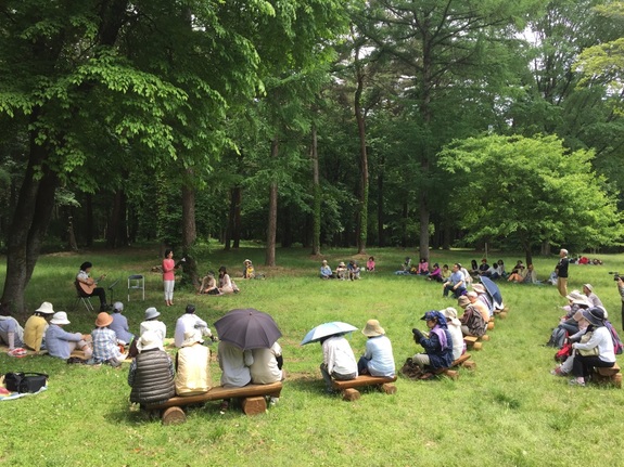 2015年5月、群馬県赤城自然園での野外朗読の様子。暑い中、80人以上のお客様がいらっしゃいました。この日は群馬テレビの取材も入り、夜の番組で放送されました。