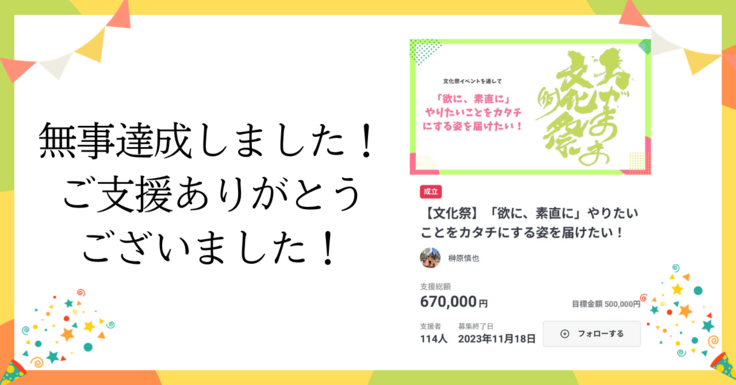 ご支援いただいた皆様、本当にありがとうございました!おかげさまで無事達成することができました✨