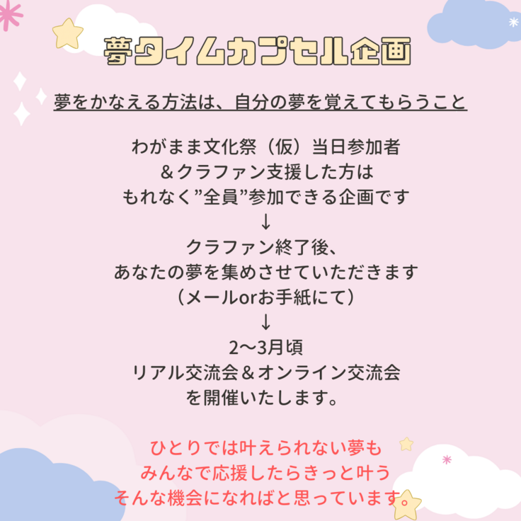 ・「夢タイムカプセル」企画に参加可能(支援完了後、メール等にて「あなたの夢」をメッセージで回収させていただきます)