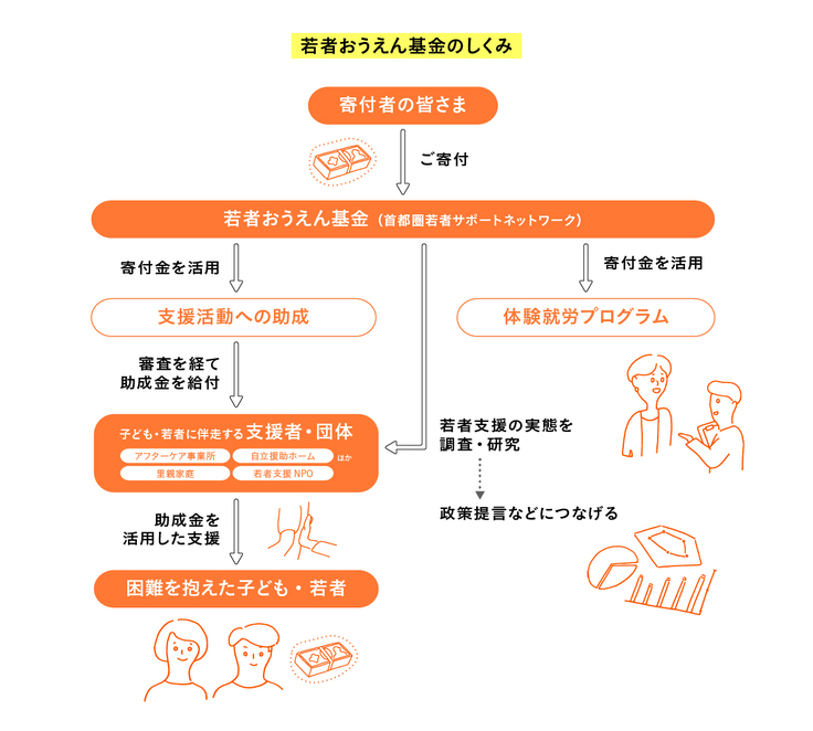 若者おうえん基金では、皆さまから広くご支援を募り、集まったお金を助成金として支援団体・伴走支援者などに給付することで、若者の支援活動に役立てています。