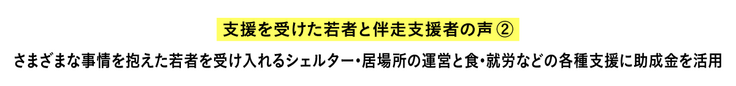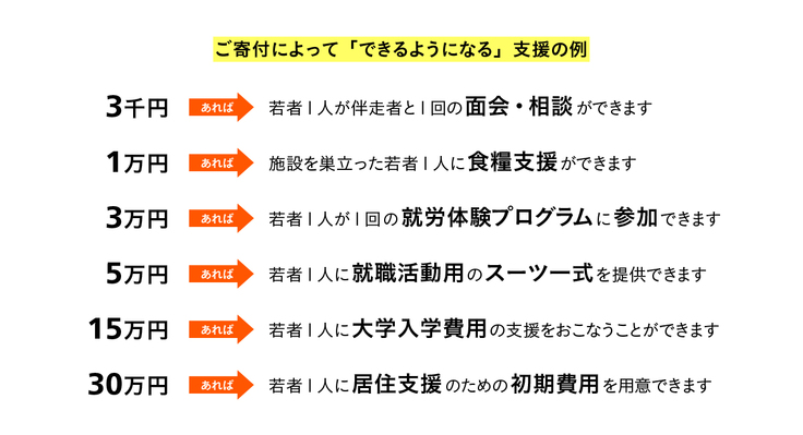 そんな若者たちを支援のプロである支援団体・伴走支援者の方々と共にサポートし、彼らが将来をあきらめずに生きていける社会づくりに取り組む基金が、今回ご寄付を募る「若者おうえん基金」です。