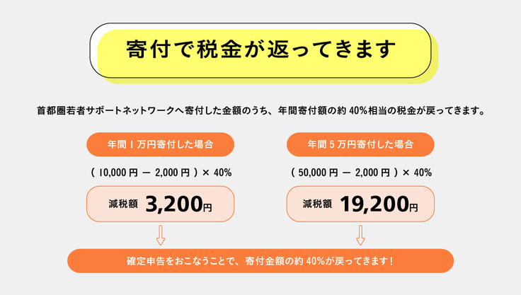 ※首都圏若者サポートネットワークへの寄付の受け皿となる公益社団法人ユニバーサル志縁センターは平成31年4月1日(認定日)、内閣総理大臣より「公益社団法人」としての認定を受けましたので、ご寄付には、特定公益増進法人に対する寄附金としての税法上の優遇措置が適用され、所得税(個人)、法人税(法人)の損金算入限度額の特例が受けられます。
