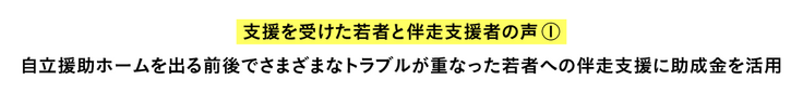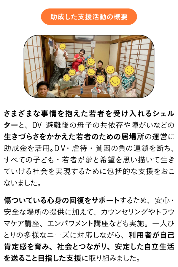 実際に、18歳以降の措置解除後の社会的養護出身者や保護されることなく虐待の経験を生き抜いた若者たちを支える団体の活動が、若者おうえん基金のご支援により活動継続し、発展していく姿を目の当たりにしてきました。