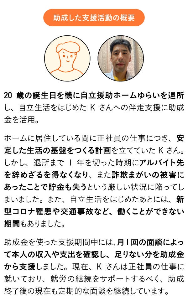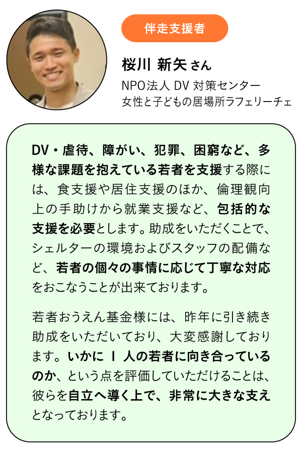これからも助成活動を通じて、誰にも頼ることができない若者たちに、「あなたの将来を応援している人がいる」「あなたが抱えている困難をどうすれば解決できるか真剣に悩んでいる人がいる」ということを伝えていきます。