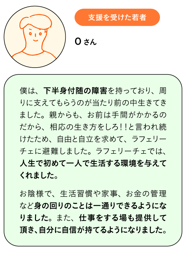 そもそも人は、自分ひとりの力で生きられるものでもありません。しかし、頼ることのできる身近な大人がいない若者たちが、この日本の社会にはたくさんいます。だからこそ、同じ社会に暮らすみんなの力で、彼らが学び、働き、社会の一員としてみずからの力を発揮して生きていくことを応援する仕組みが必要ではないでしょうか。
