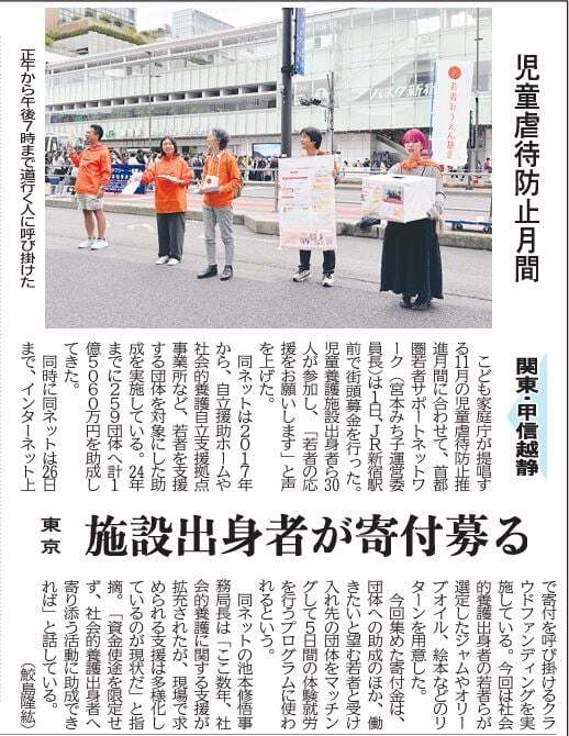 こども家庭庁が提唱する11月の児童虐待防止推進月間に合わせて11月1日に新宿駅南口で実施した街頭募金の様子が福祉新聞・Yahoo!ニュースに「児童養護施設出身者が寄付募る 児童虐待防止月間」というタイトルで掲載されました。