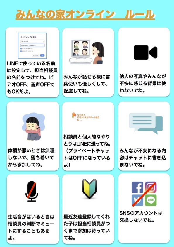 安全性を担保するため、参加者にはLINEの担当相談員の名前をつけてもらう、子どもたち同士のトラブルを防ぐため、SNSの交換は禁止、居場所中のプライベートチャットはoffなど、ルールを設定しています