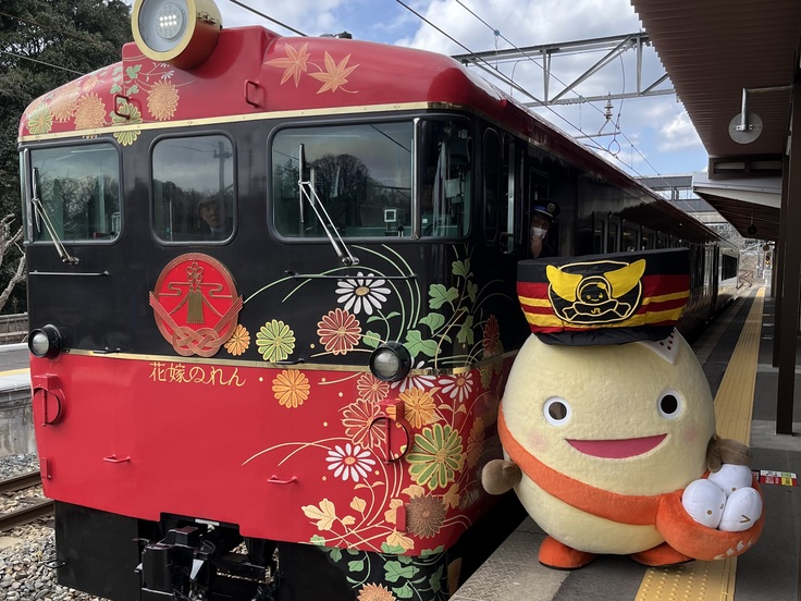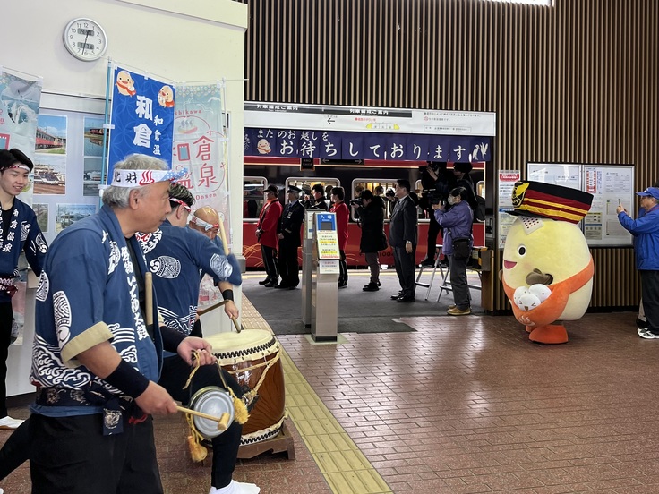 和倉温泉駅では、和倉いで湯太鼓保存会による太鼓や花嫁のれんの設置、PRキャラクターのわくたまくんも駆けつけ皆様をお迎えしました。