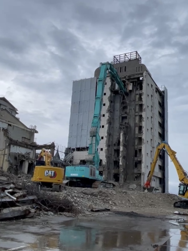 この解体作業には、日本国内に数台しかない大型重機が九州より搬入されており、その規模の大きさに、私どもも復興への強い意志を感じております。