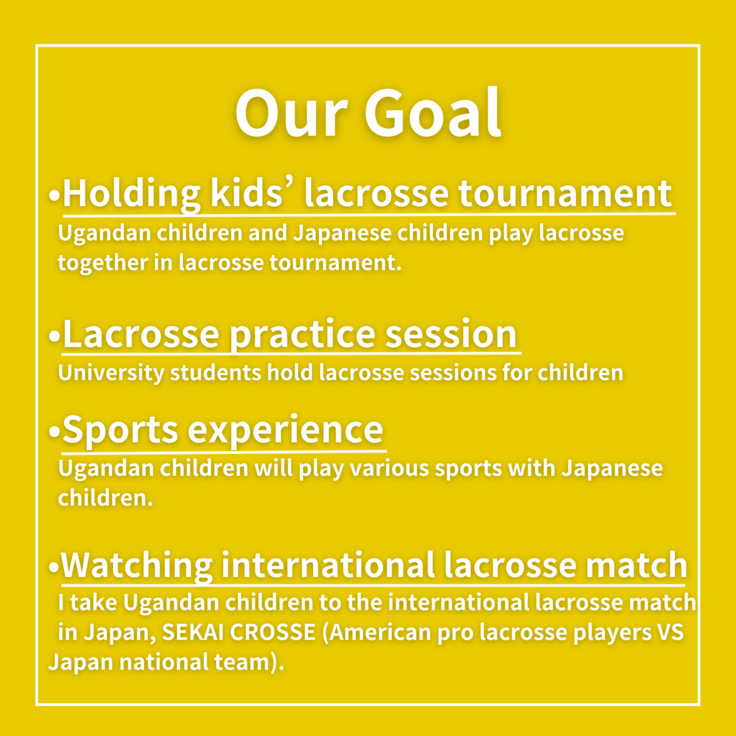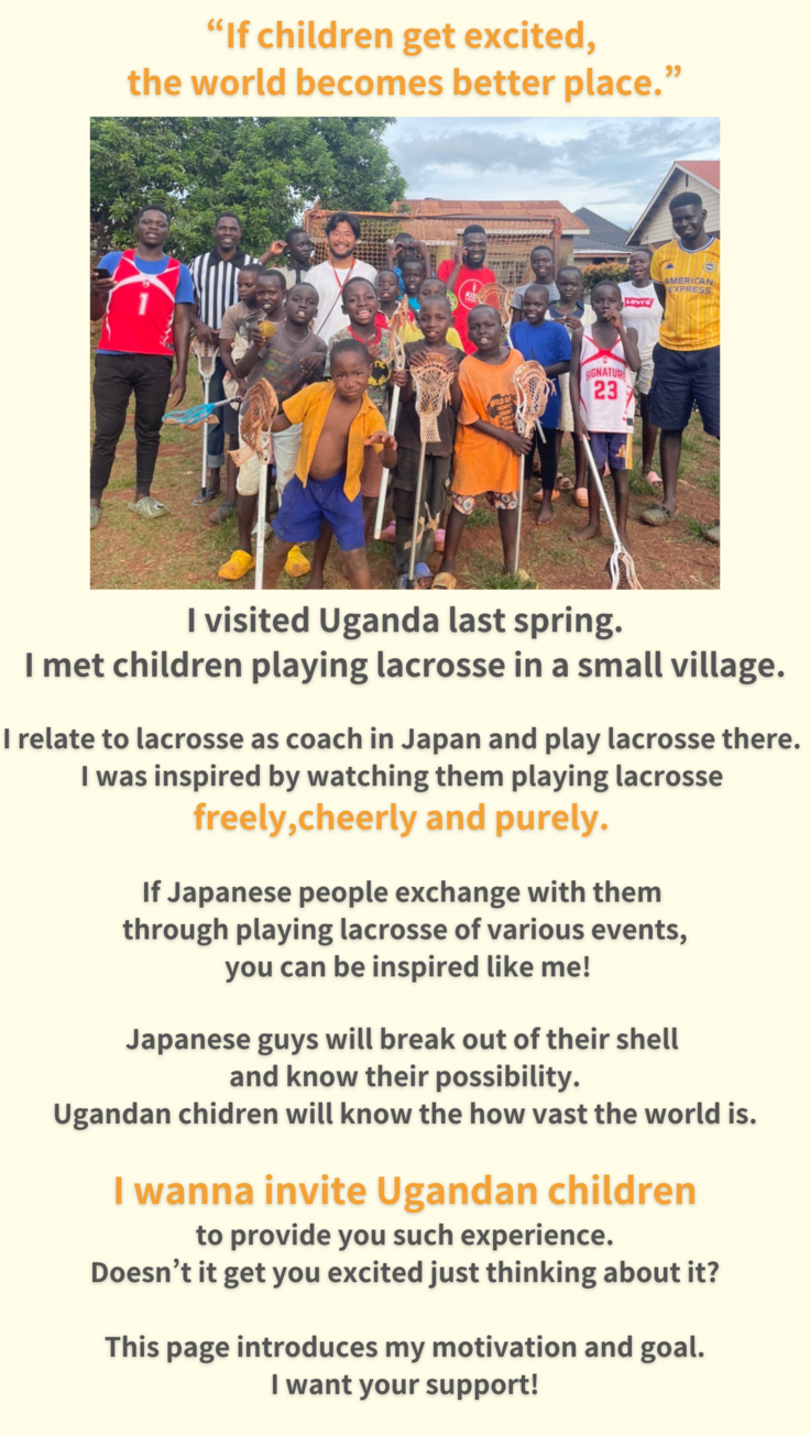 I want Ugandan children to know and see the world. To see various worlds is a lifelong treasure for children. To know there are many lacrosse players in different countries, it is fun to play together without language and the world expands in front of them will be the trigger to know new possibilities. It is fun to make such experiences through lacrosse.