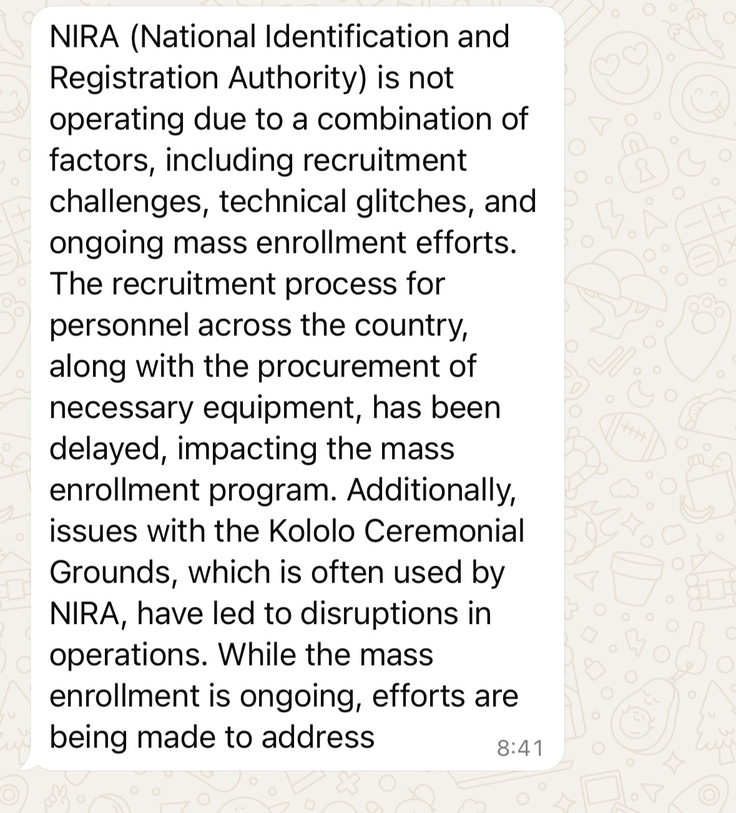 NIRAという国民身分証明書登録機関が閉鎖してしまっていることが要因だそうです。