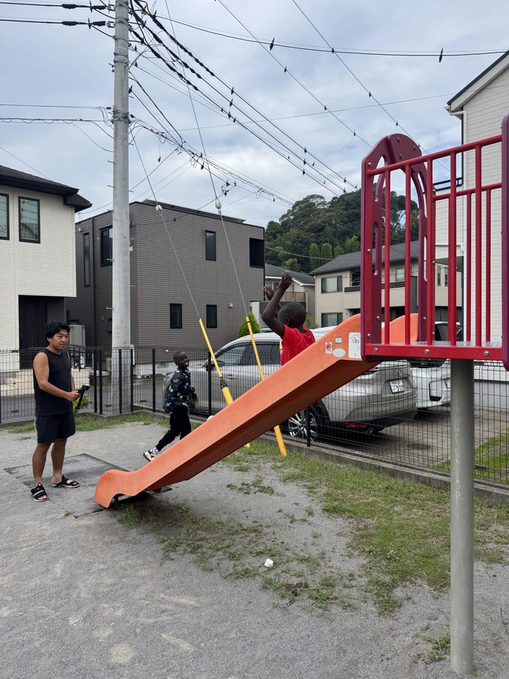 近くの公園で滑り台を体験しました。