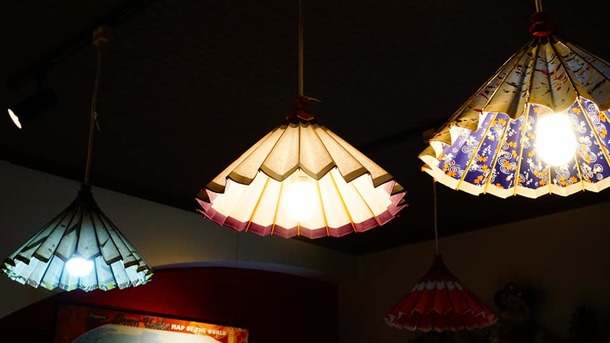 実は和傘行灯やランプシェードは工作的な発想から製作したものです。和傘づくりのために仕入れる和傘の骨には、バラバラのものや曲がっているものも混ざっています。じゃあ曲がっている骨をどうしようかな、和傘に使えなくても何か他に出来ないかな、というところから、行灯やシェードであれば開閉はしないので、一度曲がった骨をまっすぐにすれば良い。そうした発想でつくってみたら、意外とウケたんです。