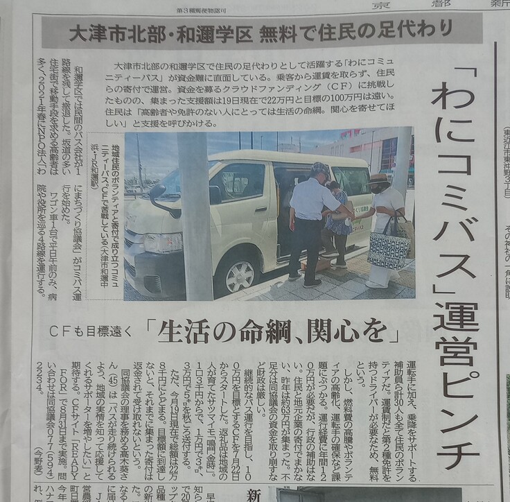 今回のクラウドファンディングの活動を含め、コミバスの事が京都新聞8月21日18面に掲載されました。残り10日間です