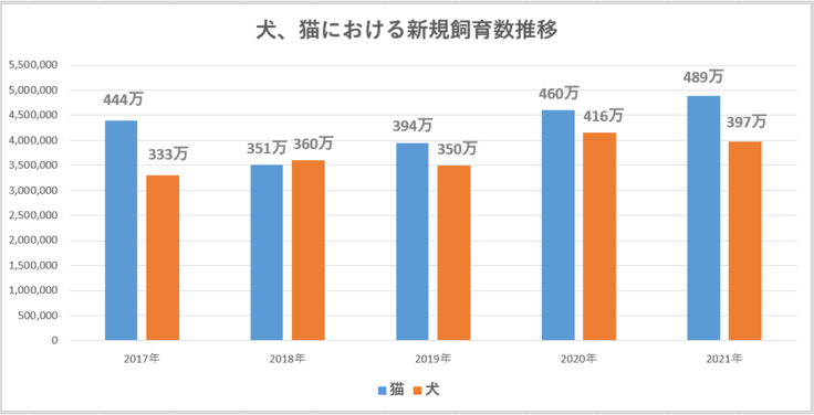 現在、コロナなどの影響でペット新規飼育数は約20%増加、毎年犬猫ともに数万の飼育数が増えています。