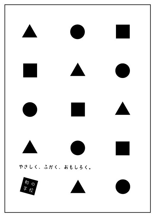 子どもたちにとっても親しみのあるかたちである「まる」「さんかく」「しかく」をデザインのベースにしながら、和の学校のコンセプトである「日本の伝統をやさしく、ふかく、おもしろく。」というメッセージの一部をキャッチコピーのようにあしらい、和の学校のロゴを採り入れたデザインです。チケットホルダーのような小さなサイズを想定しています。
