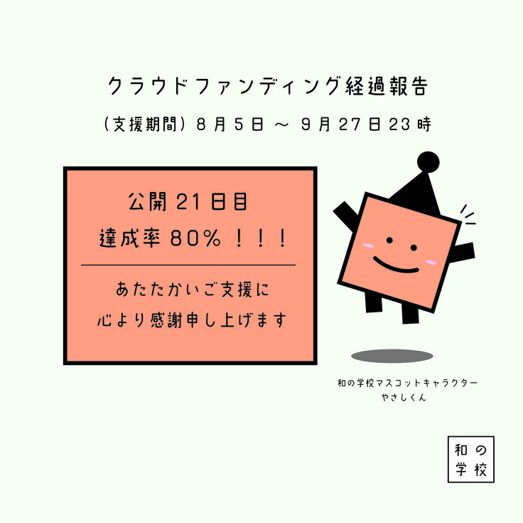皆さまからのあたたかいご支援のおかげで、クラウドファンディングをスタートしてから21日目となる本日、達成率80%を超えることができました!!!