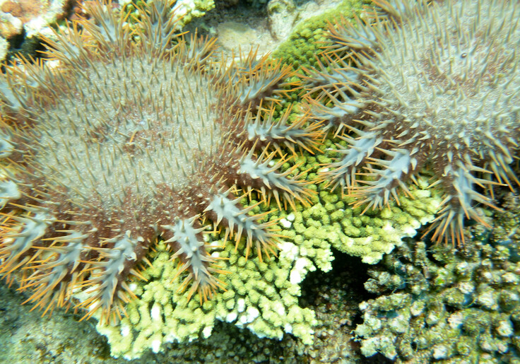 また、サンゴを食べるオニヒトデの大量発生も、生活排水や農地などから出る栄養塩が海に流れ出ることによって誘発されると考えられています。オニヒトデが大量発生すると、周辺のサンゴは食べつくされてしまいます。