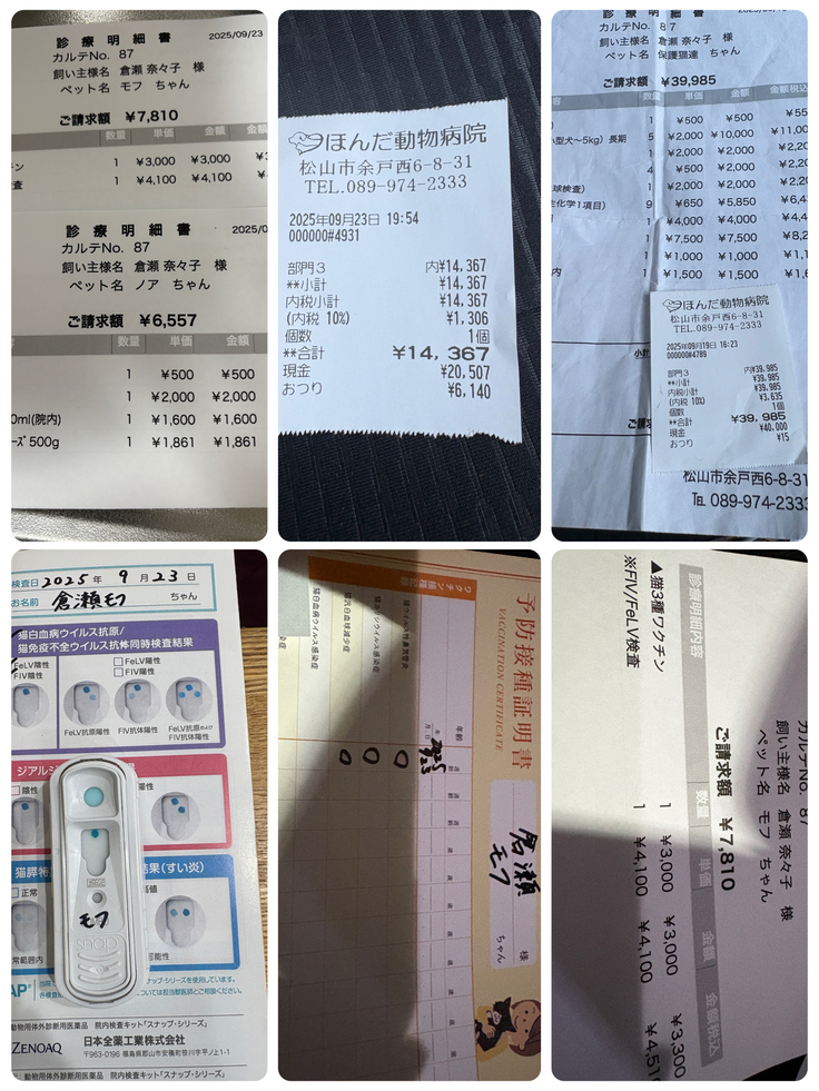 9月分の医療費は添付の領収書以外に保護猫たち15頭のワクチン接種以外に、駆虫薬レボプラ)、子猫たち2回目ワクチン接種9頭、不妊手術9頭があります。