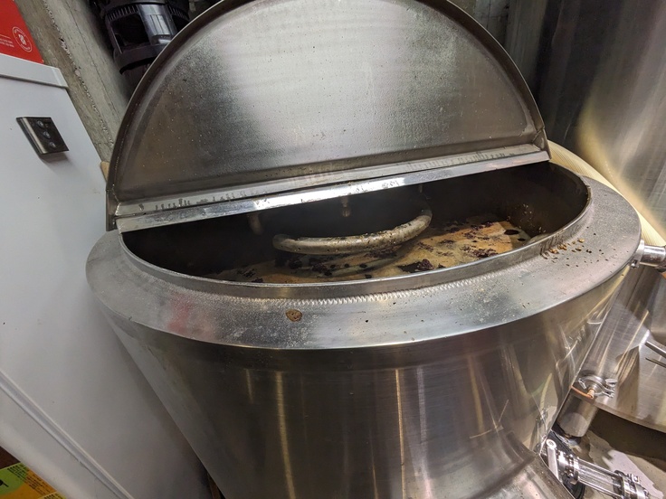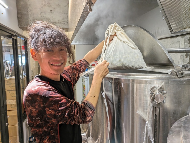 でっかい鍋で、麦芽や古代米を煮る