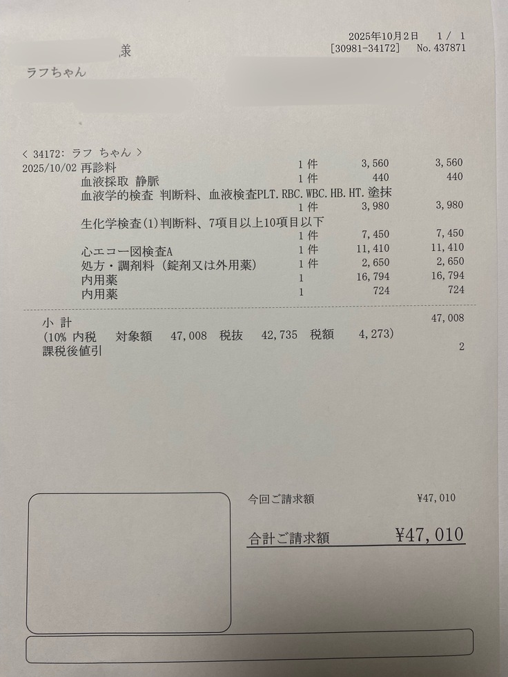 ただ大動脈弁の逆流はまだ続いており、心臓の大きさも基準よりやや大きめとのことです。