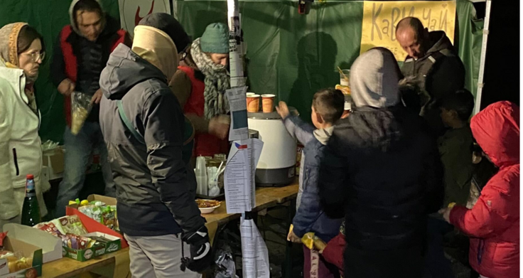 翌朝にスロバキヤとの国境越えをひかえ、不安な夜をすごす人びとに飲み物や軽食を出しているIVYの救護所