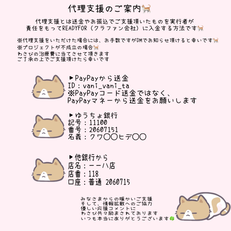 一方、操作方法が分からないという方からは、「代理支援」という形での支援も承っています。私へ直接支援金をお振込みいただき、支援手続きを代行してクラウドファンディングに反映させるという方法です。